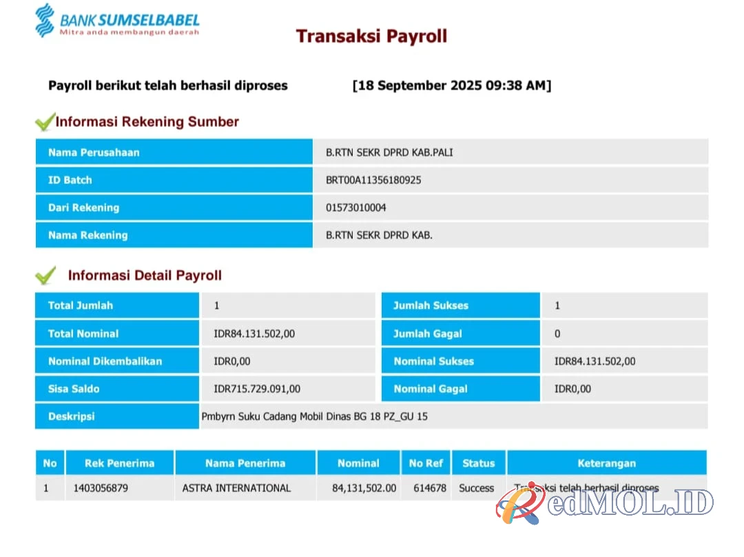Adapun anggaran yang disorot, yakni transaksi pembayaran Suku cadang untuk mobil Dinas dengan plat BG 18 PZ pada tanggal 18 September 2025 lalu.